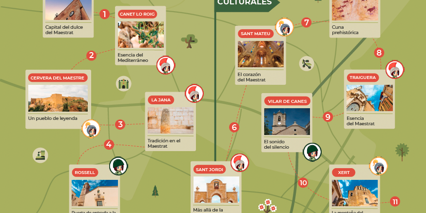A partir del conocimiento de los recursos se ha realizado una propuesta de rutas culturales del Maestrat. Se ha usado el recurso principal de cada municipio como atractor, ya que es algo que identifica al municipio y sus gentes, es visible a través del patrimonio material (edificios) e inmaterial (fiestas y tradiciones) y, además, permite contextualizar el momento histórico y relacionarlo con el conjunto del territorio del Maestrat.