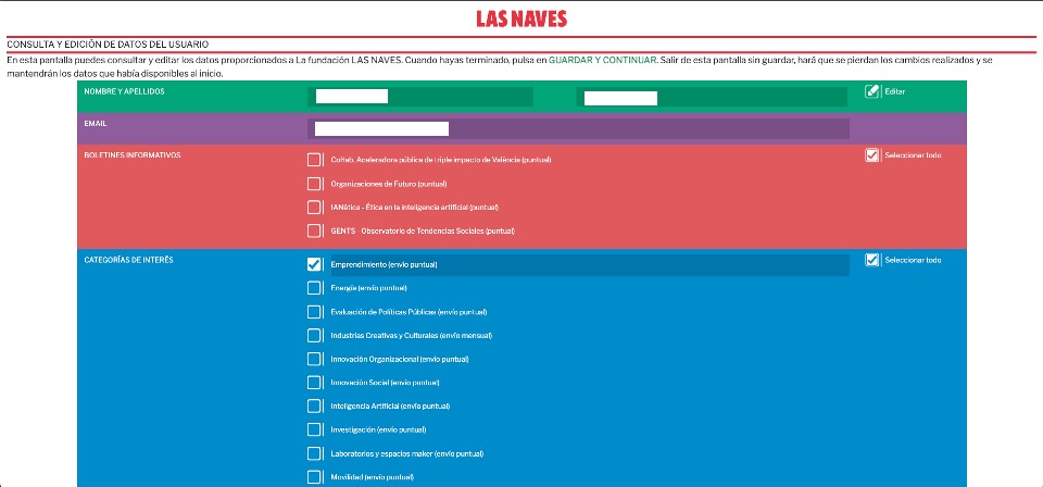 - Consultar sus datos personales almacenados en la base de datos de Las Naves, suscripciones a boletines informativos, inscripciones a eventos, conexiones a WiFi abierta, y más.