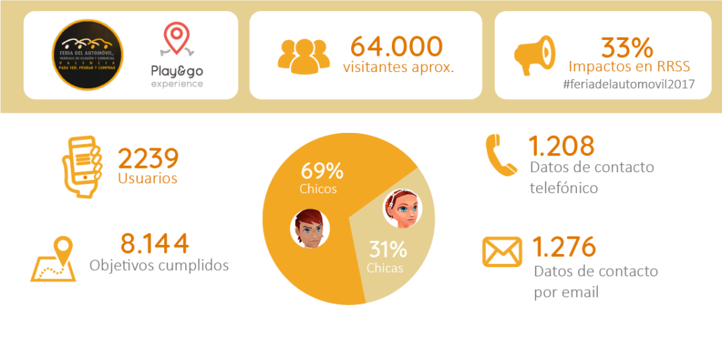 En cuanto a los resultados obtenidos fueron muy satisfactorios. La Feria del Automóvil tuvo una afluencia de, aproximadamente, 64.000 visitantes. La aplicación fue utilizada por 2.239 usuarios, que lograron un total de 8.144 objetivos. De éstos el 69% fueron hombres y el 31% restante mujeres. En cuanto a los leads, se obtuvieron 1.208 teléfonos y 1.276 mails de la gente que participó y mostró sus intereses a través de la aplicación, lo que permite realizar una segmentación que sea muy útil para las empresas, pero también para los visitantes, ya que les pueden enviar publicidad sólo de aquello en lo que estén interesados. En cuanto al alcance en redes sociales, una tercera parte de los impactos de #feriadelautomovil2017 se produjeron a través de nuestro perfil oficial y de trabajadores de Play&go experience.