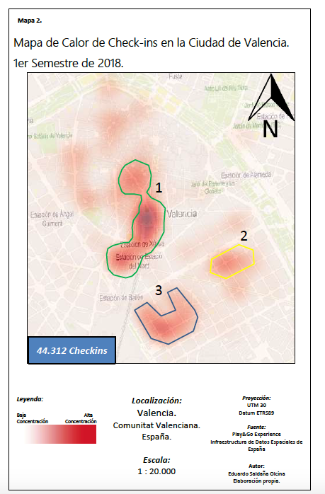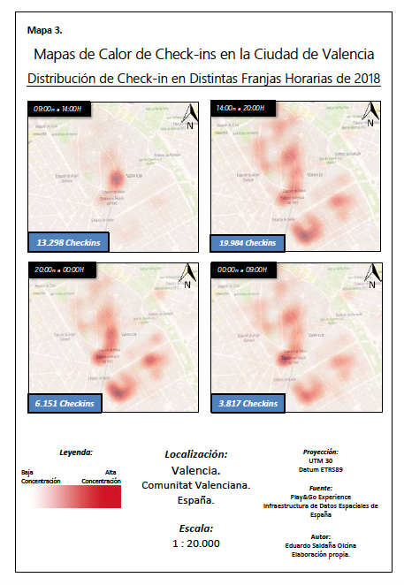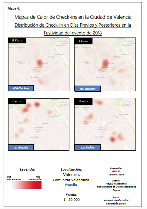 En esta investigación aplicada, Play&go experience hemos tenido el honor de aparecer en dos ocasiones, como ejemplo de buenas prácticas como uno de los ganadores del “ITH Smart Destination Awards 2018” y como estudio de caso, aplicado a una ciudad turística, Valencia, a través de los datos que le facilitamos de uno de nuestros eventos más reconocidos, con la intención de hallar cuál es el valor que aporta el geomarketing una vez utilizados los datos sobre los que se van a trabajar. A partir de la organización de estos datos en tablas de información, el autor ha creado una serie de mapas de calor mediante el Sistema de Información Geográfica (SIG) QGIS, para analizar en qué lugar y en qué momento se realizan esos “checkins” por los turistas en la ciudad de Valencia.