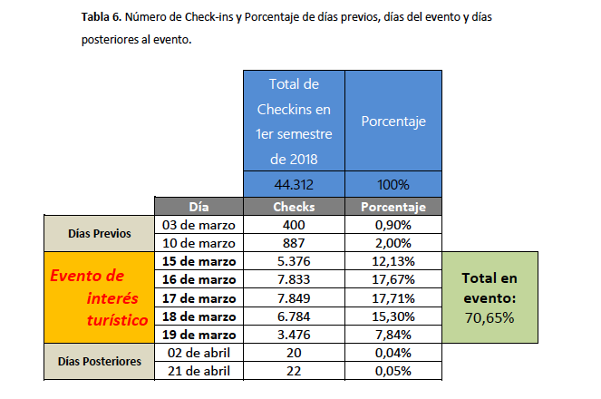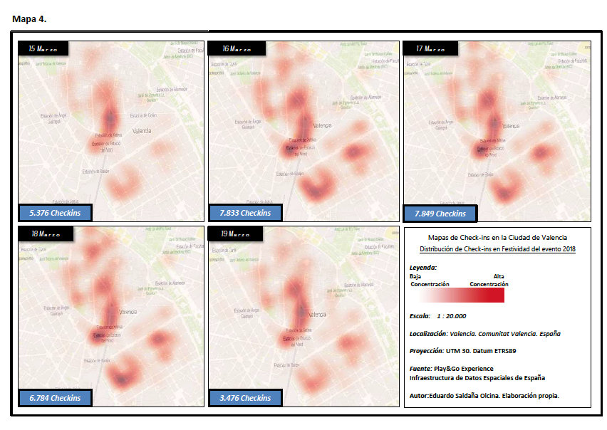 En conclusión, la tabla 6 muestra la importante repercusión que tiene ese evento en el turismo para la ciudad de Valencia ya que el 70,65% del total de “Check-ins” del primer semestre de 2018 se produce en solo 5 días y el 29,35% de los “Check-ins” se distribuyen a lo largo de los restantes 360 días del año, por lo que será de especial interés, analizar en qué zonas se produce la actividad turística y en este caso lo hicimos a través de unos mapas de calor de los días seleccionados del 2018 para el estudio de caso y observamos que de nuevo la Zona 1, 2 y 3 y muy en especial la Zona 1 vuelven a ser las que reúnen la mayoría de los registros. Por otro lado, los días previos (3 y 10 de marzo) al evento, la Zona 1 es la que recibe notablemente más Check-ins que las otras dos zonas, no obstante, se produce un fenómeno interesante en los días posteriores (2 y 21 de abril) en que el que denota una nueva zona en la zona norte de la Ciutat Vella de Valencia, muy cercana el Río Turia y es que puede que en esta zona hubiera algún evento importante del que se podría tener constancia para próximas fechas o eventos que se dieran en la próxima ocasión para comercializar un producto o servicio turístico complementario.