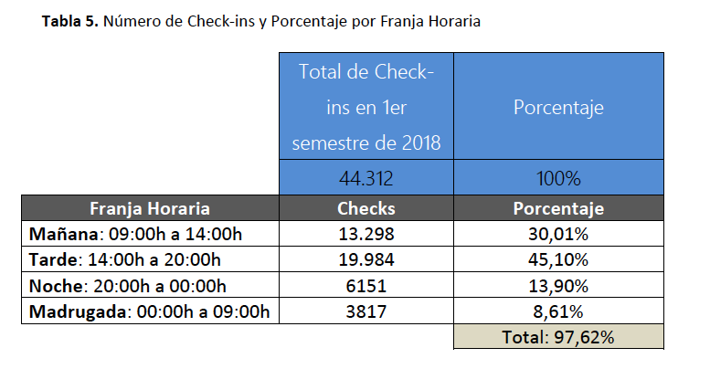 Según la tabla 5, la mayor parte de los “Check-ins” que se realizaron durante el período estudiado fueron en la franja horaria de “Tarde” entre las 14:00h a las 20:00h con un total de 19.984, representando un 45,10% del total y que junto con los “Check-ins” de la franja horaria de la “Mañana” resultan ser el 75,11% del total, algo más de las tres cuartas partes del total mientras que en la franja de “Noche” y “Madrugada” se realizaron el 24,89 de los “Check-ins”, lo cual es una cantidad significativa.